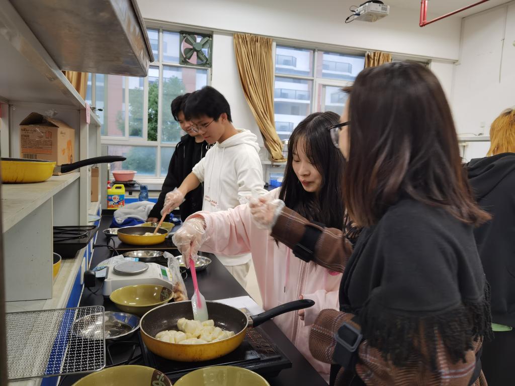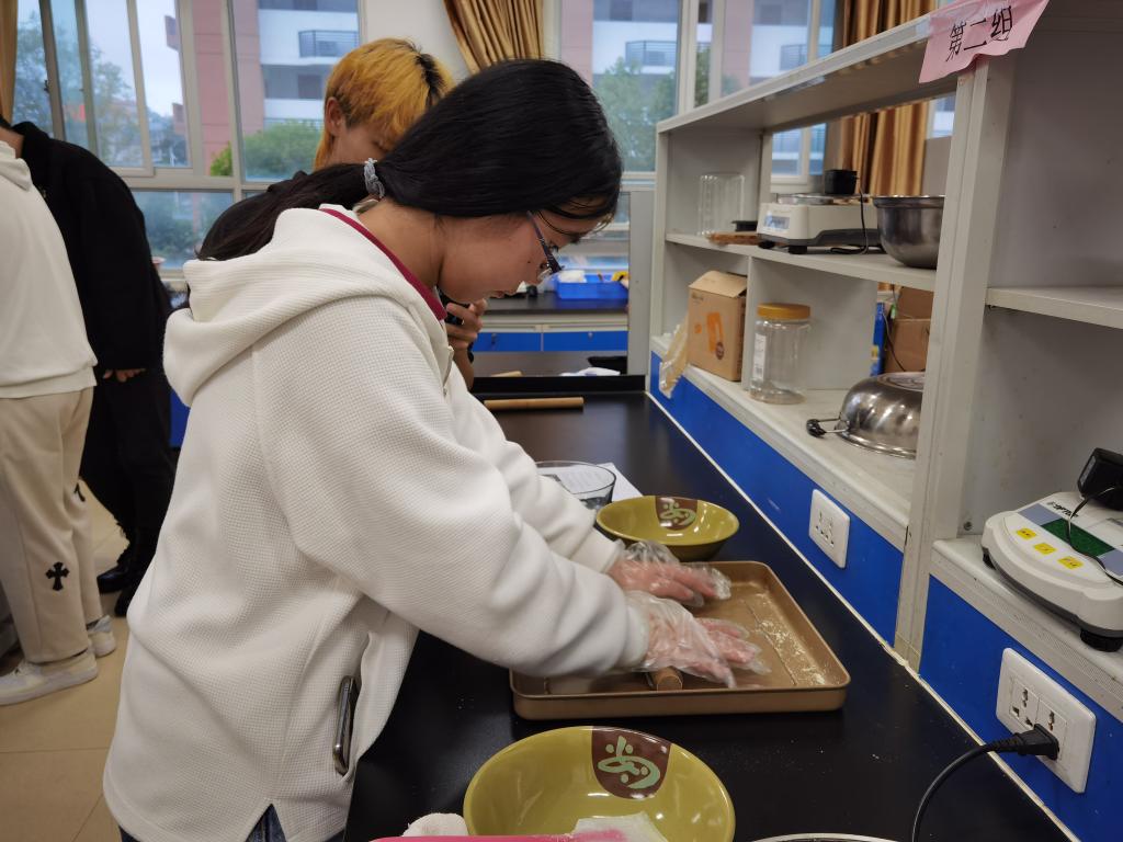 活动现场,黄艺老师简要介绍了雪花酥的工艺配料以及雪花酥手工制作的技巧后便开始演示教学。在她的耐心讲解和操作下,同学们两两一组进行了食材的分类称重,雪花酥的制作、定型再到最后的切块装袋,整个制作过程,大家井然有序、乐此不疲。当一个个精致漂亮的雪花酥展现在众人眼前时,同学们脸上洋溢着满满的幸福感和成就感,彼此品尝、分享着自己的小成果。