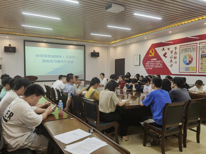 为深入学习贯彻习近平新时代中国特色社会主义思想,推动主题教育走深走实,切实做好林学系顶岗实习的组织管理和指导工作,2023年7月5日下午,林学系召开林业技术(三定生)顶岗实习座谈交流会,学院党委委员、副院长李肇锋,林学系党总支书记傅成杰、团总支书记兼学生科科长马艳红、教务科科长俞群、顶岗实习指导老师以及2024届林业技术(三定生)全体学生参加会议,会议由教务科科长俞群主持。