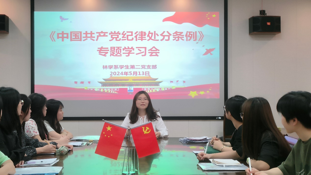 为深入学习贯彻习近平总书记关于党纪学习教育的重要讲话和重要指示精神,引导党员同志们学纪、知纪、明纪、守纪,进一步提高同志们尊崇党章、遵守党规的纪律意识,林学系学生第二党支部于5月13日晚在林学楼四楼会议室召开关于《中国共产党纪律处分条例》(以下简称《条例》)专题学习会。本次会议由支部书记樊寿娜主持,支部全体师生党员参加本次会议。