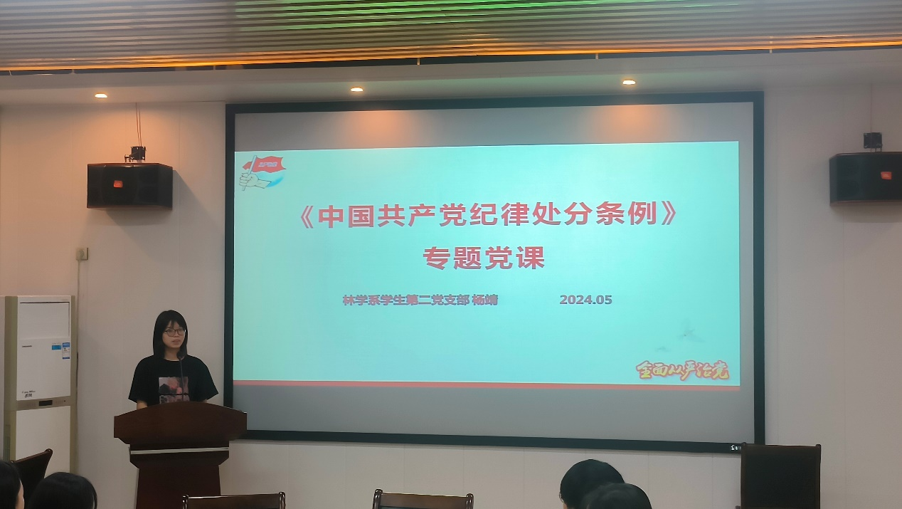 为牢固树立全体师生党员干部党章党规党纪意识,自觉做到守纪律、讲规矩,知敬畏、存戒惧,切实发挥好党员先锋模范作用。林学系学生第二党支部于2024年5月21日晚在林学楼四楼会议室开展学习《中国共产党纪律处分条例》(以下简称《条例》)专题党课,本次专题党课由支部书记杨靖主持,支部全体师生党员参加本次会议。