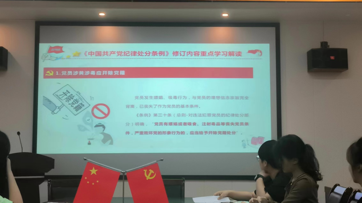 会上,杨靖老师分别从《条例》中的政治纪律、组织纪律、廉洁纪律、群众纪律、工作纪律和生活纪律逐章逐条进行讲解,结合支部党员的实际情况边解读条例,边讲述案例。把典型案例作为“活教材”,以案说德、以案说纪、以案说法、以案说责,进一步教育引导党员们坚定理想信念、筑牢守纪思想防线。同时杨靖老师要求支部全体党员要深化思想认识、提高政治站位,在生活工作中一言一行一举一动都应该以党纪为尺、知戒守纪,切实将党纪党规铭刻在心、力践于行,始终如一做到对党忠诚。