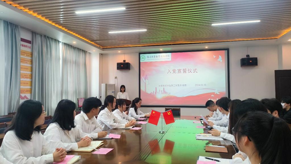 为进一步强化新发展党员的党员意识、铭记入党初心、坚定理想信念,充分发挥党员先锋模范作用,林学系学生第二党支部于2024年6月18日在林学楼会议室举行新一期中共预备党员入党宣誓仪式。本次会议由支部书记杨靖主持,支部全体中共预备党员参加本次宣誓仪式。