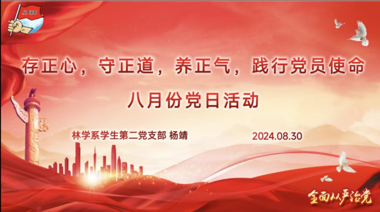 为深入学习宣传贯彻习近平总书记关于党纪学习教育的重要讲话和重要指示精神,扎实推动党纪学习教育走深走实,林学系学生第二党支部于8月30日开展“存正心、守正道、养正气,践行党员使命”主题线上会议,会议由支部书记杨靖主持,支部全体师生党员参加此次会议。