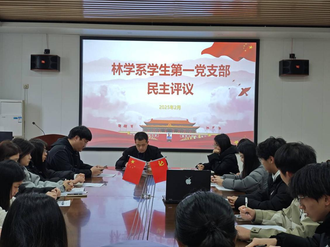 为深入学习贯彻习近平新时代中国特色社会主义思想,巩固深化党纪学习教育成果,综合发挥党的纪律教育约束、保障激励作用,为进一步全面深化改革、推进中国式现代化提供坚强纪律保证,2025年2月21日下午,林学系学生第一党支部在林学系会议室召开2024年度组织生活会,并开展民主评议党员,本次会议由支部书记叶知勇老师主持,支部全体师生党员参会。