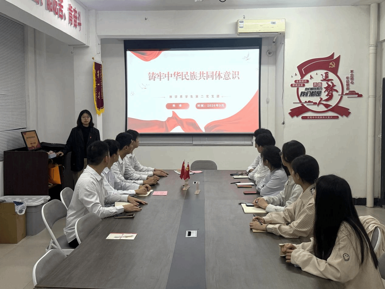 为深入学习贯彻习近平新时代中国特色社会主义思想,特别是习近平总书记关于加强和改进民族工作的重要思想,引导学生党员深刻领悟中华民族共同体意识的丰富内涵与重大意义,2026年3月28日晚间,林学系学生第二党支部开展“铸牢中华民族共同体意识”主题党日活动。本次主题党日活动由支部书记杨靖主讲,支部全体学生党员参加。