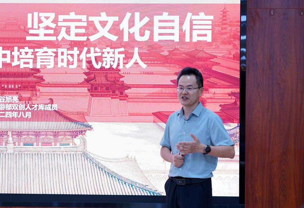 8月2日上午,文化和旅游部双创人才库成员、文化和旅游部干部管理学院学员谷旭亮老师携其文创作品展开了以《讲好中国故事,坚定文化自信---守正创新培育时代新人》为主题的“长安故事”分享,在课件中那一幅幅、一件件充满“长安”元素的画卷和文创作品中,学员们仿若“春风得意马蹄疾,一日看尽长安花”,知晓了长安鲜为人知的历史,了解了长安繁华背后的内涵。长安是中国文化自信的名片,作为教育者的我们应当了解、挖掘更丰富、更深层的中国文化,为新时代青年讲好中国故事,共同坚定文化自信。