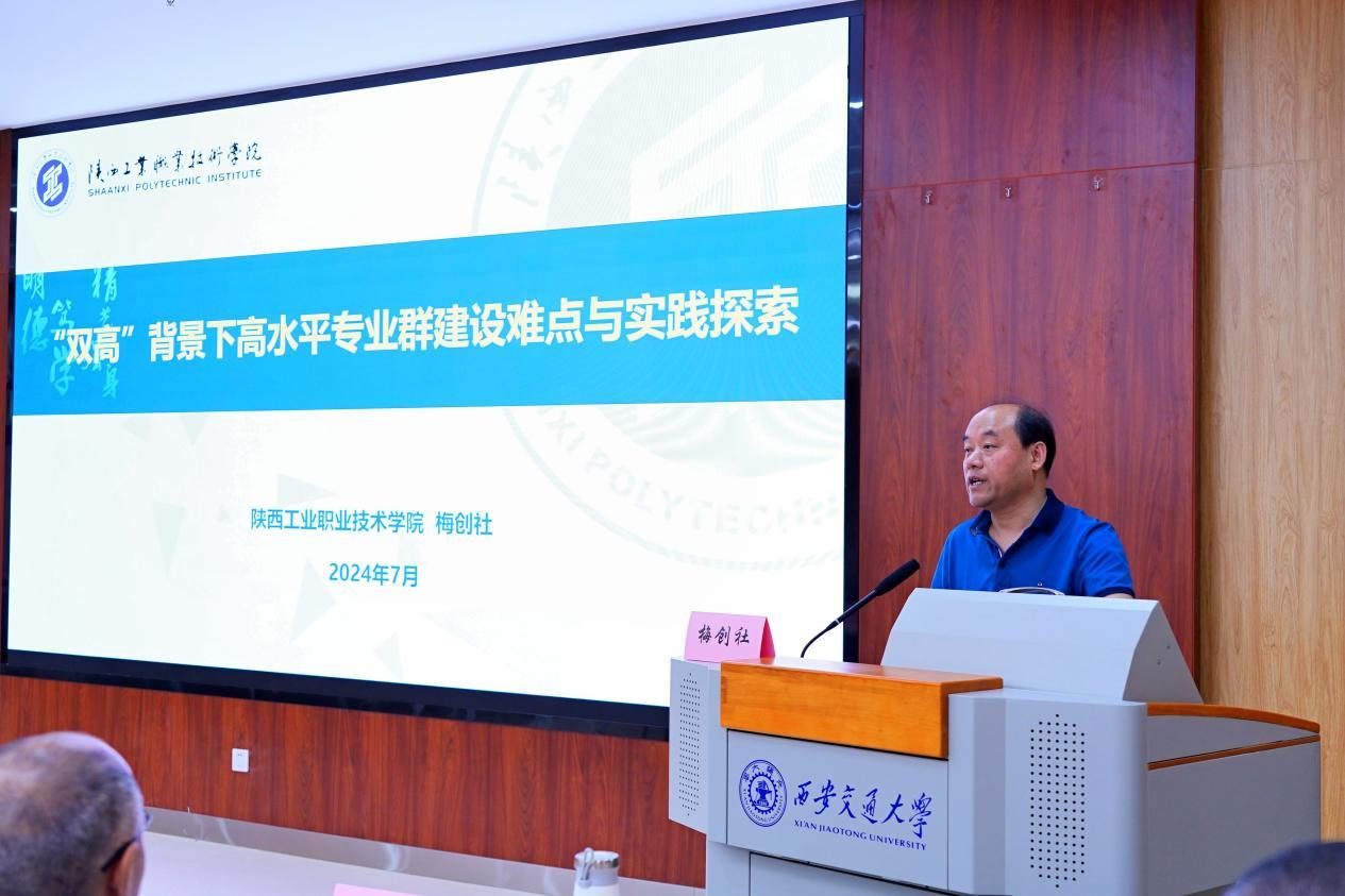 7月30日上午,针对学院近年工作重点,陕西工业职业技术学院党委委员、副院长梅创社以《“双高”背景下高水平专业群建设的难点与实践经验》为题分享了陕西工业职业技术学院“双高”建设经验,结合建设过程中的实践案例将专业群建设的疑难点、实施过程以及建设成效做了翔实的经验分享,并强调精准解读“双高”建设政策制度的重要性,建设过程有的放矢,以达事半功倍之效。