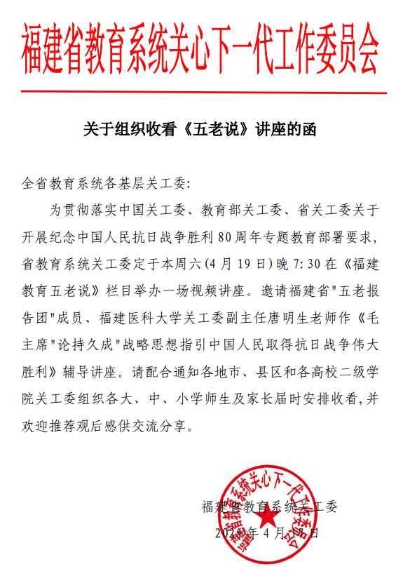 为深入开展爱国主义教育,传承红色基因,根据福建省教育系统关工委《关于组织收看<五老说>讲座的函》要求,4月19日晚7:30,福建林业职业技术学院组织师生观看了一场意义深刻的辅导讲座。