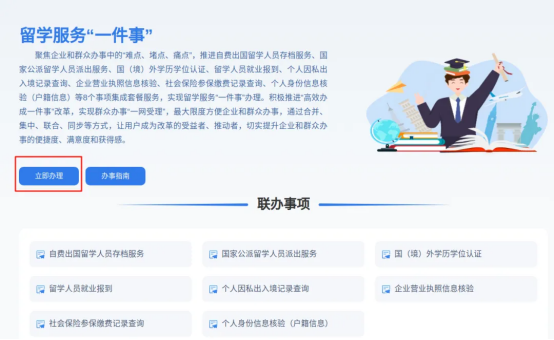 国家公派留学人员派出服务、国(境)外学历学位认证、留学人员就业报到、个人因私出入境记录查询、企业营业执照信息核验、社会保险参保缴费记录查询、个人身份信息核验(户籍信息)等8个事项集成套餐服务,实现留学服务“一件事”办理。积极推进“高效办成一件事”改革,实现群众办事“一网受理”,最大限度方便企业和群众办事,通过合并、集中、联合、同步等方式,让用户成为改革的受益者、推动者,切实提升企业和群众办事的便捷度、满意度和获得感。
