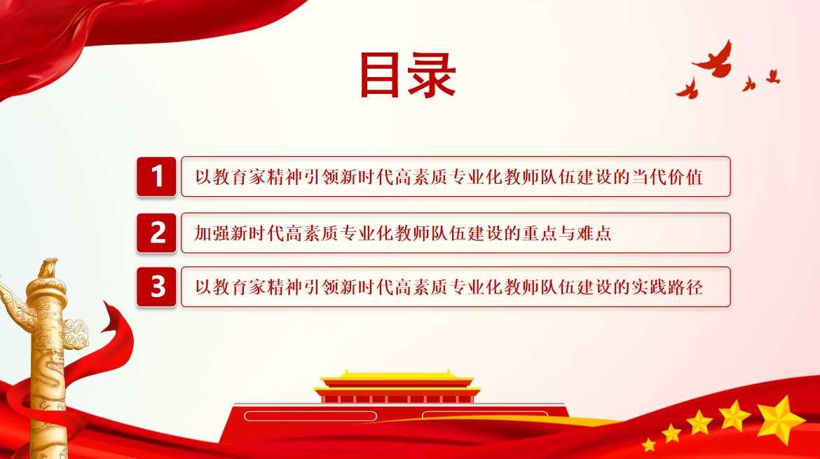 党课上,黄丽霞书记指出,以教育家精神引领新时代高素质专业化教师队伍建设具有重要当代价值,这不仅是教育高质量发展的内在需求,也是提升教师社会形象与地位的关键。接着,她分析了加强新时代高素质专业化教师队伍建设的重点与难点,强调要聚焦教师专业素养提升和师德师风建设。最后,黄处长提出了以教育家精神引领队伍建设的实践路径,鼓励教师们在教育实践中积极践行教育家精神。