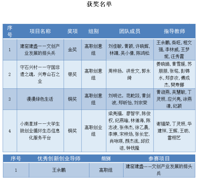 8月12日,福建省教育厅公示了第八届福建省“互联网+”大学生创新创业大赛各类奖项获奖名单。我院“建窑建盏——文创产业发展的排头兵”项目荣获金奖,“守石兴村——守国非遗之魂,兴寿山石之业”项目荣获银奖,“漫漫绿色生活”项目、“小南星球——大学生就创业循环生态信息化服务平台”项目荣获铜奖,王余鹏老师荣获职教赛道优秀创新创业导师,实现了学院在福建省“互联网+”大学生创新创业大赛中的历史性突破。