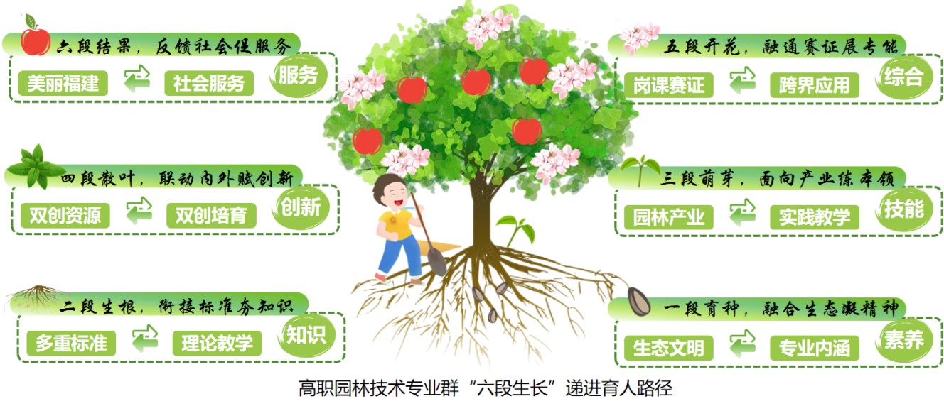 发展树木生长发育教育理念,首创六段递进式人才培养路径。一段育种,融合生态凝精神。立足生态道德教育,将生态文明嵌入专业建设内涵,凝结“敬业、吃苦、务实、进取”的天麟精神,培养学生的自然观照与生态素养。二段生根,衔接标准夯知识。对接国家职业资格标准,融《园林绿化工程项目规范》等行业标准于专业教学,按照“预知识、探问题、析原理、拓视野”夯实知识基底。三段萌芽,面向产业练本领。聚焦数字化、智慧化园林产业升级,实施校-企工学交替,将智慧物联、虚拟现实等新技术融于实训内容框架,系统性精进学生专业技能。四段散叶,联动内外赋创新。联动校内外双创基地、导师、赛事等多维资源,定期开展双创模拟竞赛,推进专创、课创与赛创的双创教学实践。五段开花,融通赛证展专能。创设岗课赛证融通教学场景,多次承办国家级、省级职业院校技能大赛,组织无人机驾驶等1+X证书考核工作,以赛证展现教学效果。六段结果,反馈社会促服务。对接“美丽福建”建设,发挥师生人才技术优势,开展园林园艺专业专业技术培训、咨询和推广等服务。
