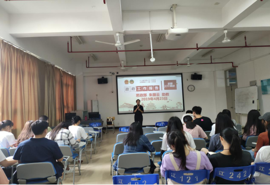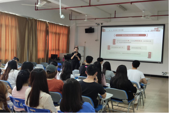 接着,朱老师重点解读了今年“两会”中李克强总理在全国人大上作的《政府工作报告》,《报告》分为三部分,第一部分:2018年工作回顾;经济运行保持在合理区间;经济结构不断优化;发展新动能快速成长;改革开放取得新突破;三大攻坚战开局良好。第二部分:2019年经济社会发展总体要求和政策取向:今年经济社会发展的主要预期目标;积极地财政政策要加力提效;就业优先政策要全面发力。第三部分:2019政府工作任务:继续创新和完善宏观调控,确保经济运行在合理区间;激发市场主体活力,着力优化营商环境;坚持创新产业改造提升,培育壮大新动能;促进形成强大国内市场,持续释放内需潜力;对标全面建成小康社会任务,扎实推进脱贫攻坚和乡村振兴;加强污染防治和生态建设,大力推动绿色发展;深化重点领域改革,加快完善市场机制;推动全方位对外开放培育国际经济合作和竞争新形势;加快发展社会事业更好保障和改善民生。朱老师从辩证唯物主义观出发以生动、质朴的语言把《报告》中的相关政策呈现给在座的老师和同学,大家收获良多。
