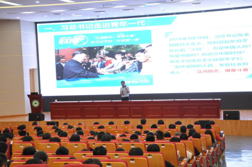 课堂在全体师生齐声合唱《我和我的祖国》中开讲,用歌声抒发了师生的爱国热情。课堂上,刘文开院长向同学们展现了习近平总书记走进青年一代的生动景象,从爱国“三问”中激励新时代大学生要“立鸿鹄志,做奋斗者”,要努力做到树理想、能吃苦、勤学习、走好路。刘院长要求同学们须通过“四要三善于”把握好自己的大学生活:要有自信、要有坚持、要有恒心、要交益友,善于利用手机、善于学会拒绝、善于把握底线。他希望同学们在这三年的学习中,能够至少参加一次技能大赛或学科竞赛;最少读20本经典名著、看20场经典电影、网络在线选修不少于20门课程;最少参加一个社团组织;最少认识50名老师和200名同学并与他们深入交谈;最少精通一种终身受益的专业技能;最少学会一种终身受用、自己喜爱的体育运动并做到长期坚持。最后,刘院长讲述了职业规划的目标和途径以及现阶段的行动策略,引导在座大学生认真细致做好自己的职业生涯规划。