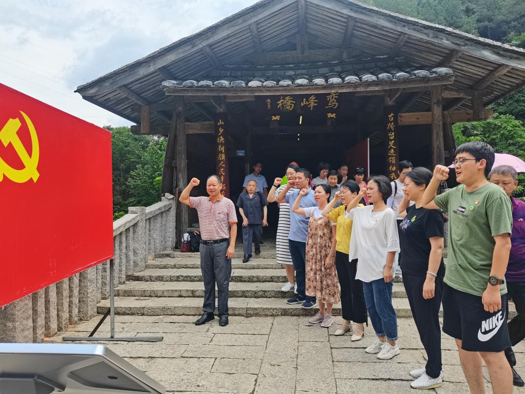 在鸾峰桥头,全体党员面向鲜艳的党旗,在支部书记郭先根同志的带领下,大家列队整齐,举起右手,在党旗下庄严宣誓:我志愿加入中国共产党……永不叛党。许多党员顿时热泪盈眶,激动不已,同志们高亢而又洪亮的声音在下党乡久久回荡。