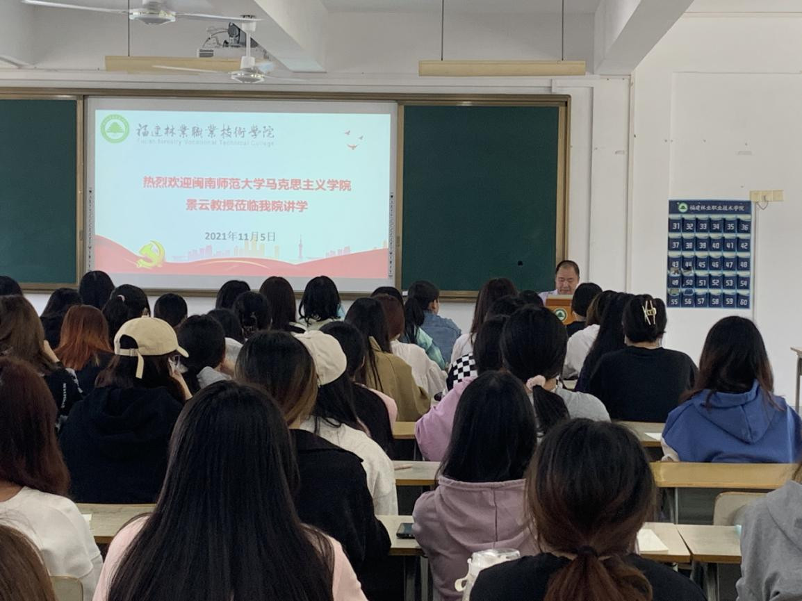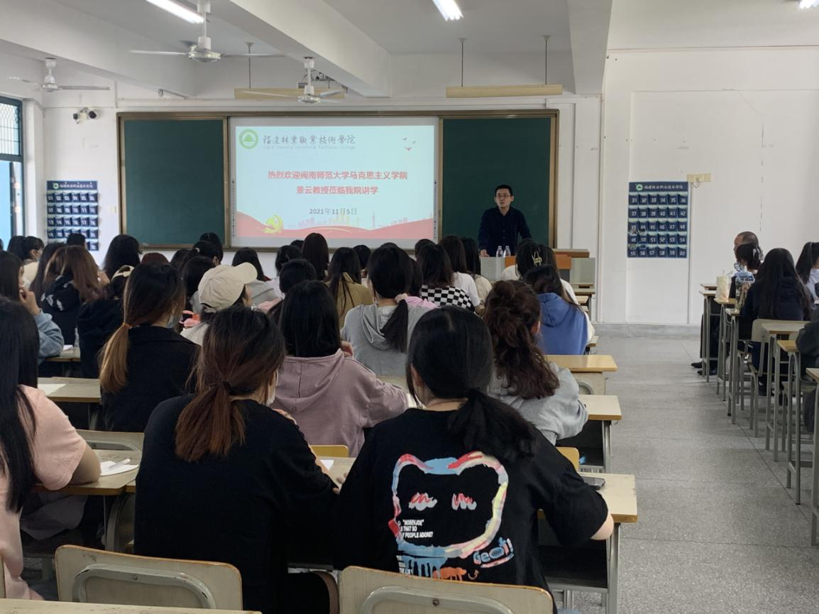 2021年11月5日下午,我院邀请闽南师范大学马克思主义学院景云教授莅临天麟校区科教楼802作了题为“国家视域下的道德与法”的专题讲座,100余名师生到场聆听。本次讲座由马克思主义学院教务科长李佳主持。