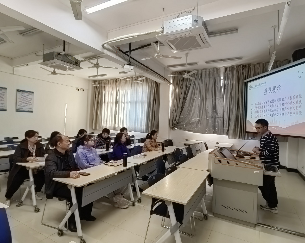 近日,中国共产党第十九届中央委员会第六次全体会议在北京举行,中共中央举行新闻发布会,指出全会最重要的成果是审议通过了《中共中央关于党的百年奋斗重大成就和历史经验的决议》。中国共产党的百年历史是一座丰富充盈的精神富矿,蕴含着共产党人的深邃智慧和无穷力量。为使广大党员教师在十九届六中全会精神中汲取奋进力量,用心用情用力学好百年党史这门“必修课”,在新征程上谱写时代新华章,11月23日下午,直属第四党支部组织开展学习“党的十九届六中全会精神”活动,本次活动由支部党员教师李建文主讲,支部全体党员参加。