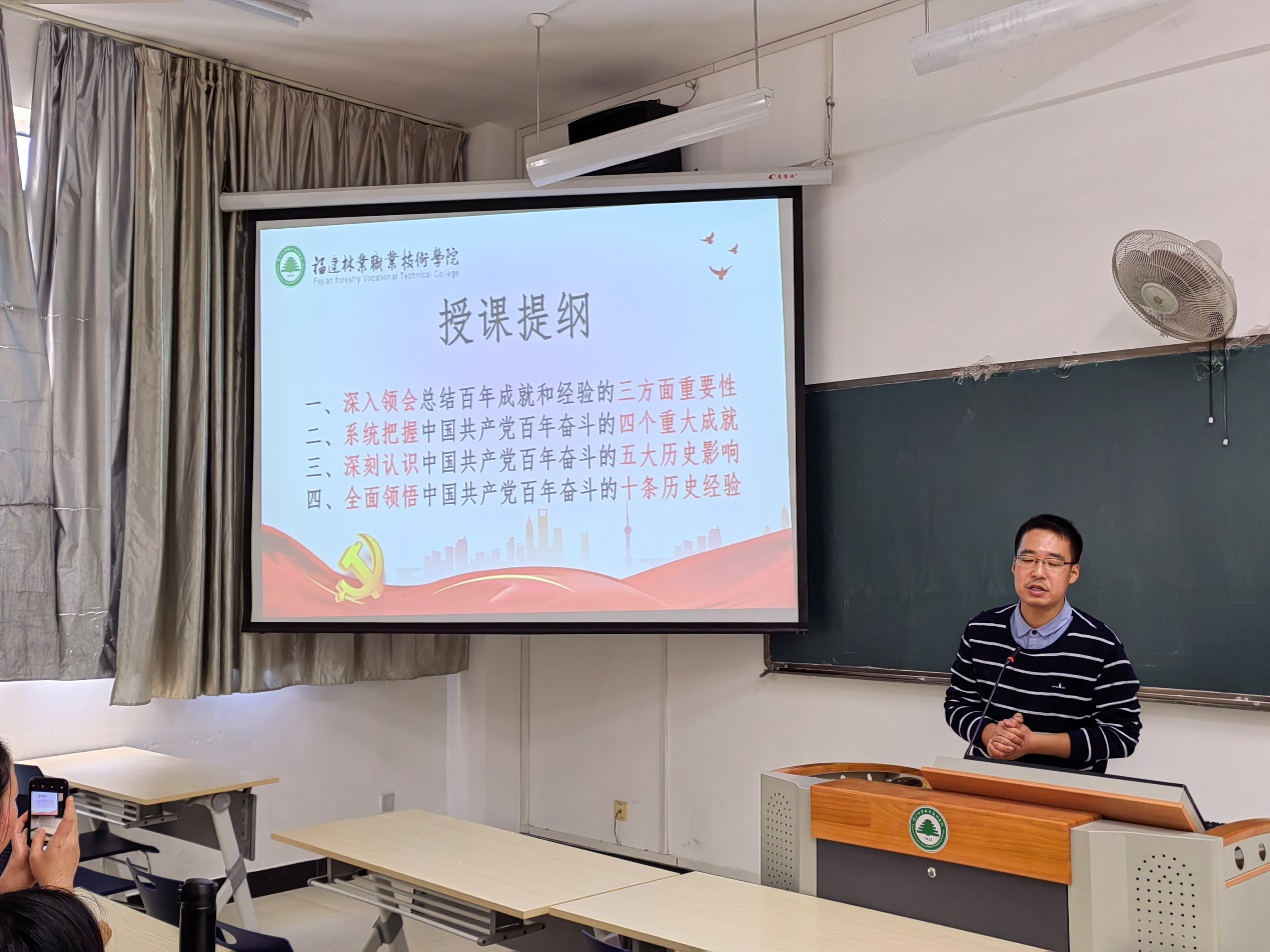 李建文老师介绍了会议审议通过的《中共中央关于党的百年奋斗重大成就和历史经验的决议》,解释说明了党的十九大六中全会对推动全党统一思想、统一意志、统一行动,团结带领全国各族人民以史为鉴、开创未来及在新时代更好坚持和发展中国特色社会主义等层面的重大历史意义。