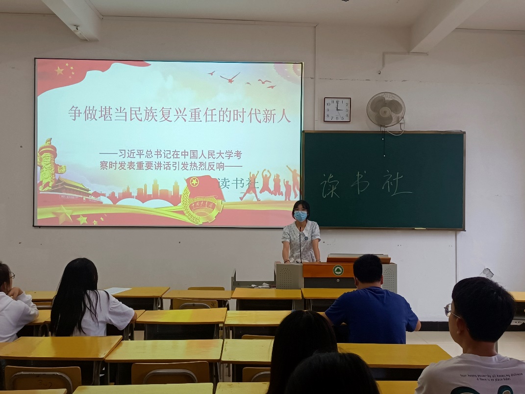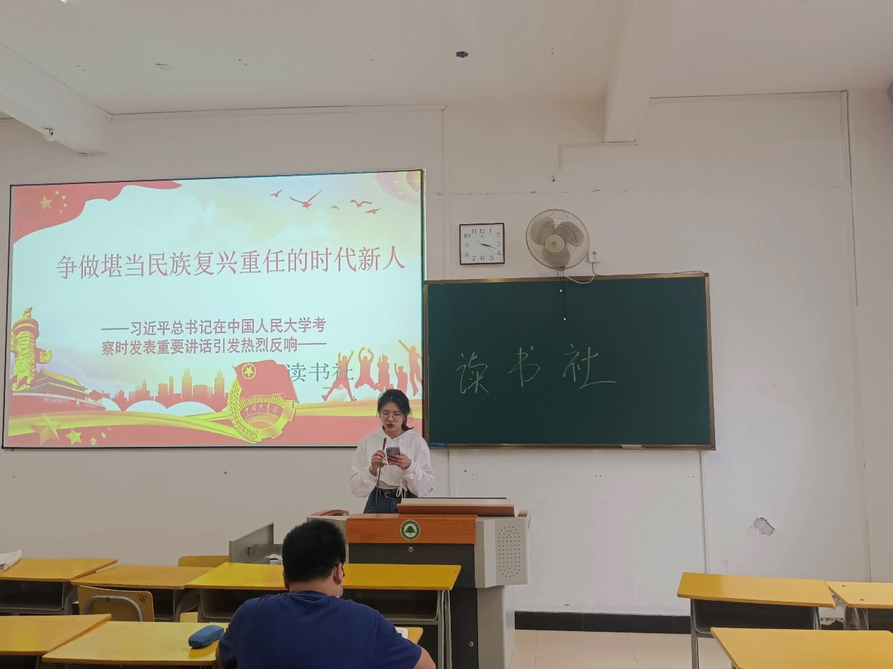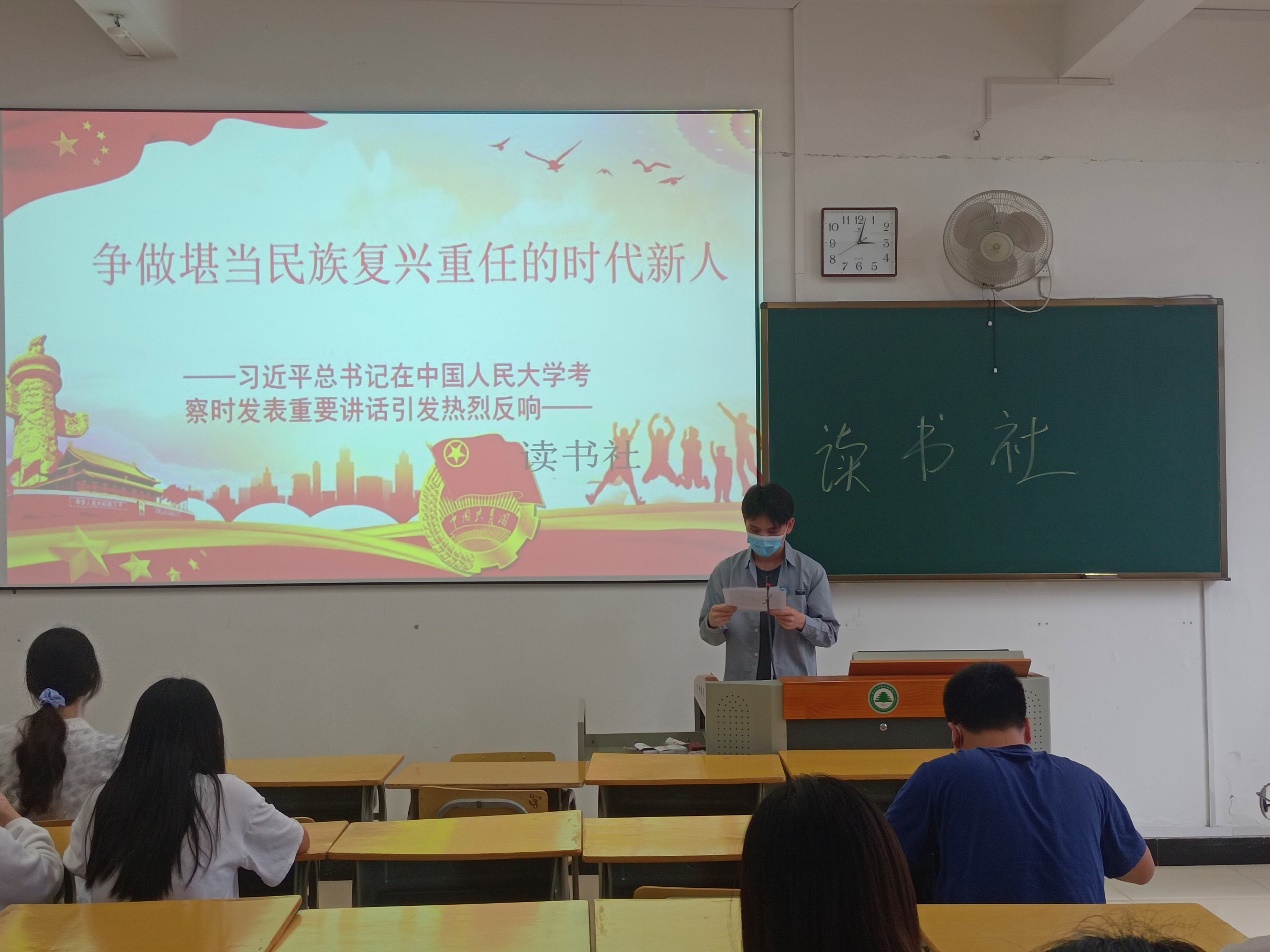 4月25日上午,中共中央总书记、国家主席、中央军委主席习近平来到中国人民大学考察调研并发表重要讲话。习近平总书记希望全国广大青年牢记党的教诲,立志民族复兴,不负韶华,不负时代,不负人民,在青春的赛道上奋力奔跑!为认真学习习近平总书记重要讲话精神,江南校区读书社于5月10日在实训四708教室,开展学习习近平总书记考察人民大学重要讲话精神的心得讲座。通过线下学习重要讲话精神、分享学习心得的方式把握学习重点提高同学们思想理论素质。