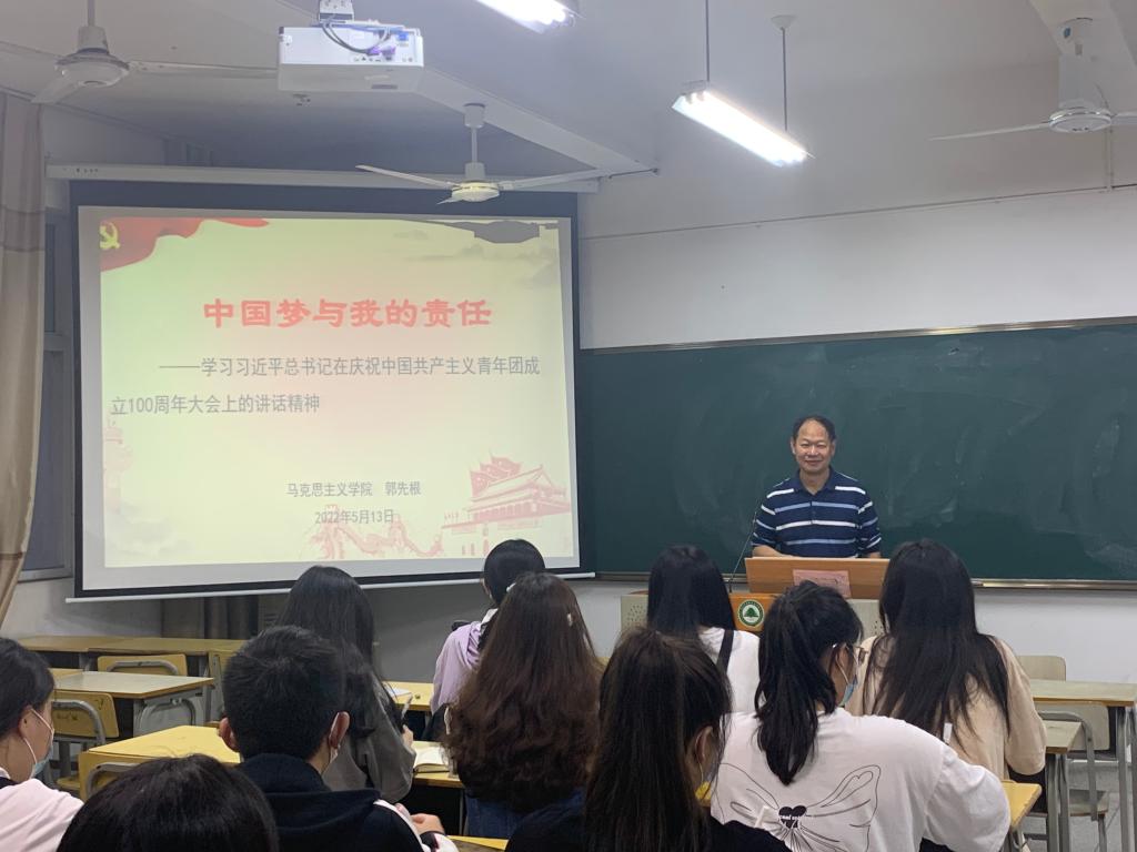 5月13日晚与5月21日下午,马克思主义学院院长郭先根分别在天麟校区科教楼203和江南校区实训四505,为习近平新时代中国特色社会主义思想读书社学员开展《中国梦与我的责任——学习习近平总书记在庆祝中国共产主义青年团成立100周年大会上的重要讲话精神》专题讲座,两个校区读书社成员分别参与学习,主持人由天麟校区读书社班主任俞玥老师和江南校区读书社班主任李晶担任。