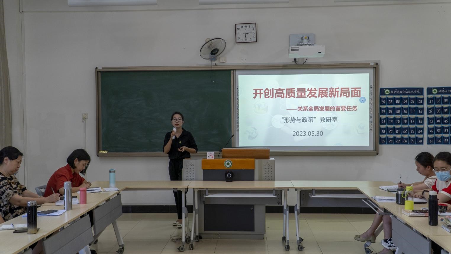 再次,“形势与政策”教研室主任朱丽云老师以《开创高质量发展新局面》为题,讲清楚高质量发展是关系全局的首要任务,讲明白发展是党执政兴国的第一要务,引导教育学生必须学好本领,为推进国家安全体系和治理能力现代化建设做出应有的贡献,确保全面建设社会主义现代化国家顺利推进。