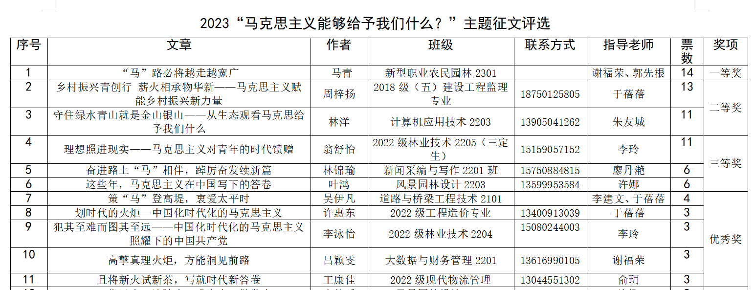 为深入学习贯彻落实习近平新时代中国特色社会主义思想和党的二十大精神,切实推进习近平新时代中国特色社会主义思想进教材、进课堂、进学生头脑,同时响应省教工委领航计划系列主题活动及福建林业职业技术学院“技能成才 强国有我”技能文化活动,马克思主义学院在全院大一学生中组织开展“马克思主义能够给予我们什么”主题征文活动。