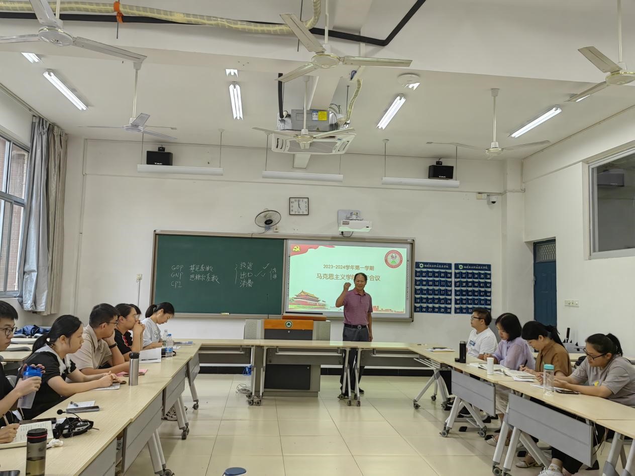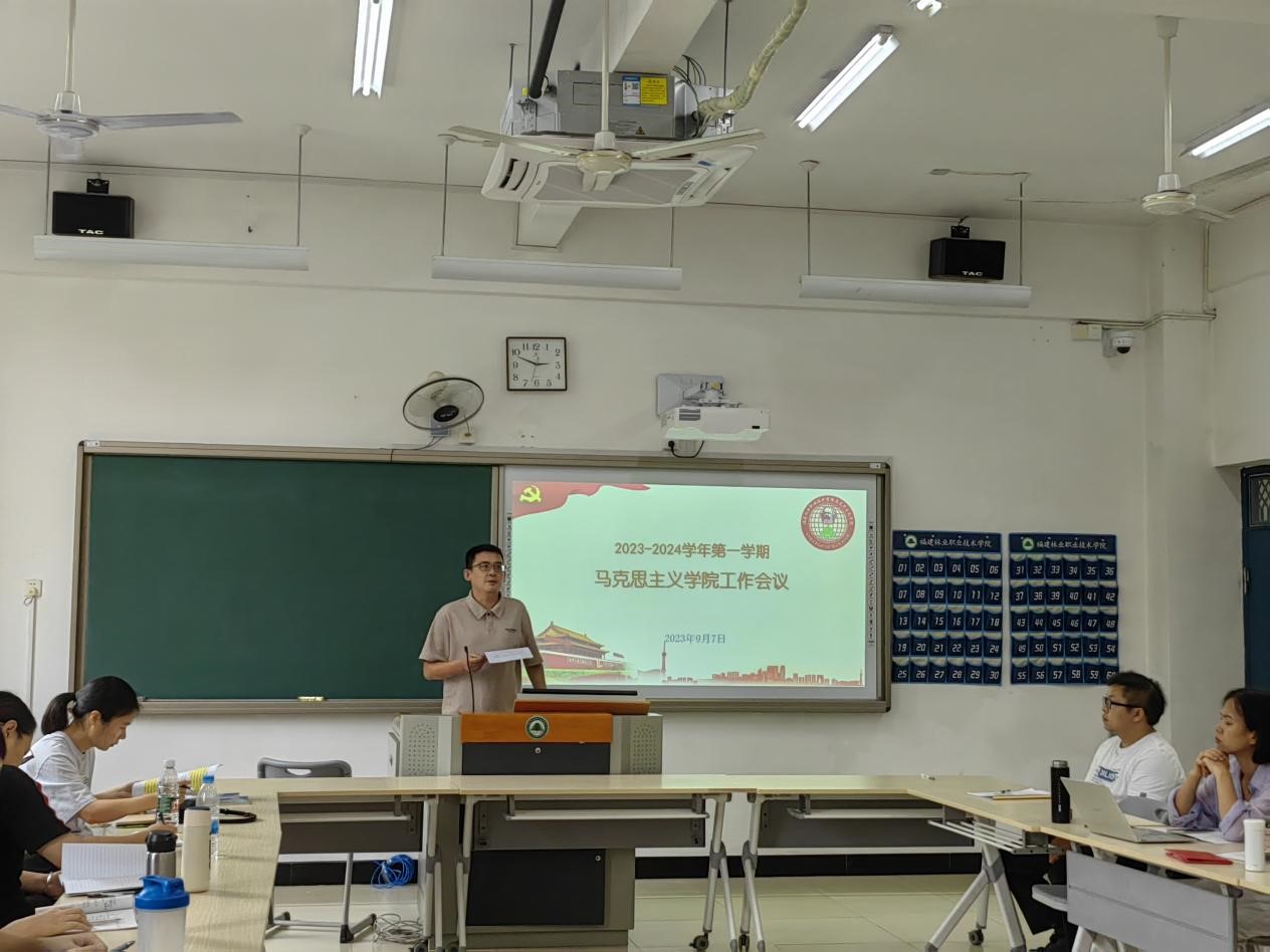 会议最后,郭先根院长以《形势与政策》课程为例,对该课程的专题选择、备课逻辑、备课方向、教学设计进行解读和展示。之后,郭先根院长代表马克思主义学院对本学期新入职的陈茜、朱聪两位教师表示热烈欢迎,并进行了总结发言。他希望:思政课教师要在平凡之中要有伟大追求;平静之中要有满腔热忱;平常之中要有强烈责任;平稳之中要有卓越进取。希望各位新老教师保持热爱、投入、执着、敬畏,做一个“有理想信念、有道德情操、有扎实学识、有仁爱之心”的四有思政教师。