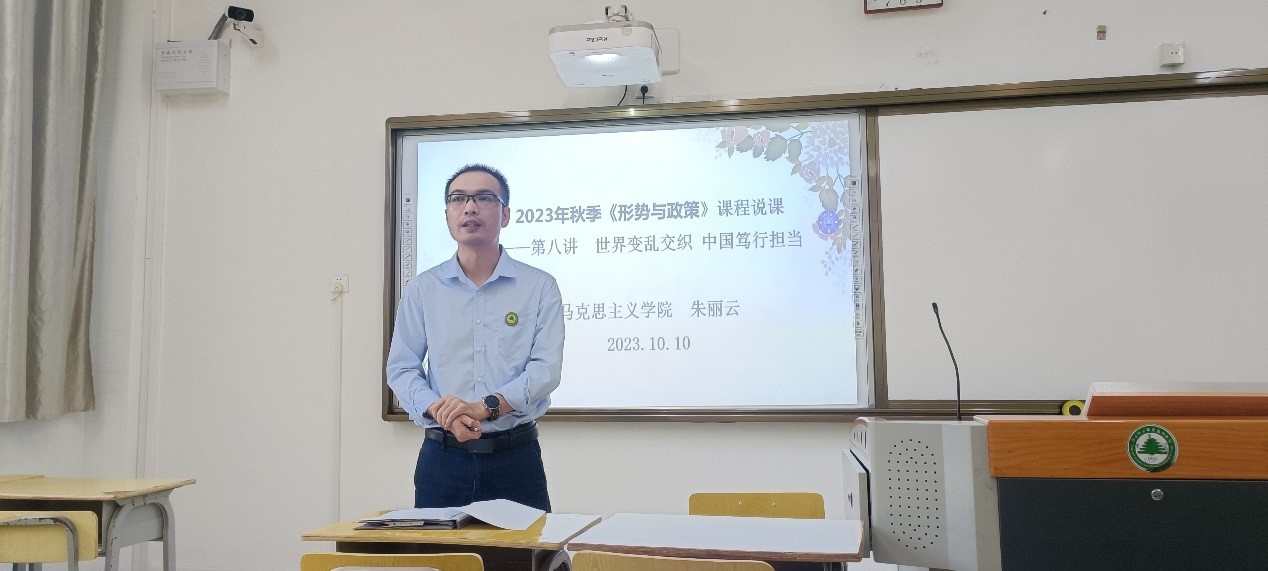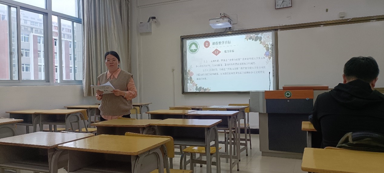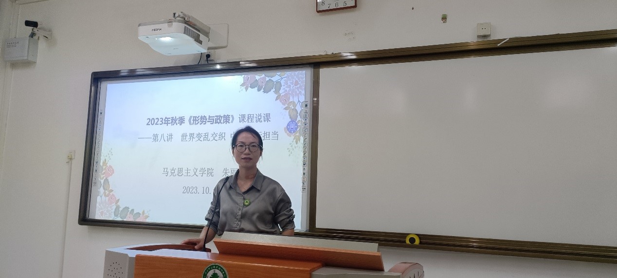 10月10日下午,马克思主义学院在教学楼303教室组织院级说课。朱丽云老师对2023年秋季学期《形势与政策》课程进行课程说课,全体思政课教师以及学院其它部门教师参加听课、评课。教务处副处长林志鹏老师,教务处质量管理中心主任林小青老师、马院副院长陆晓莉老师到场参加。德法教研室主任汪秀霞老师主持说课活动。