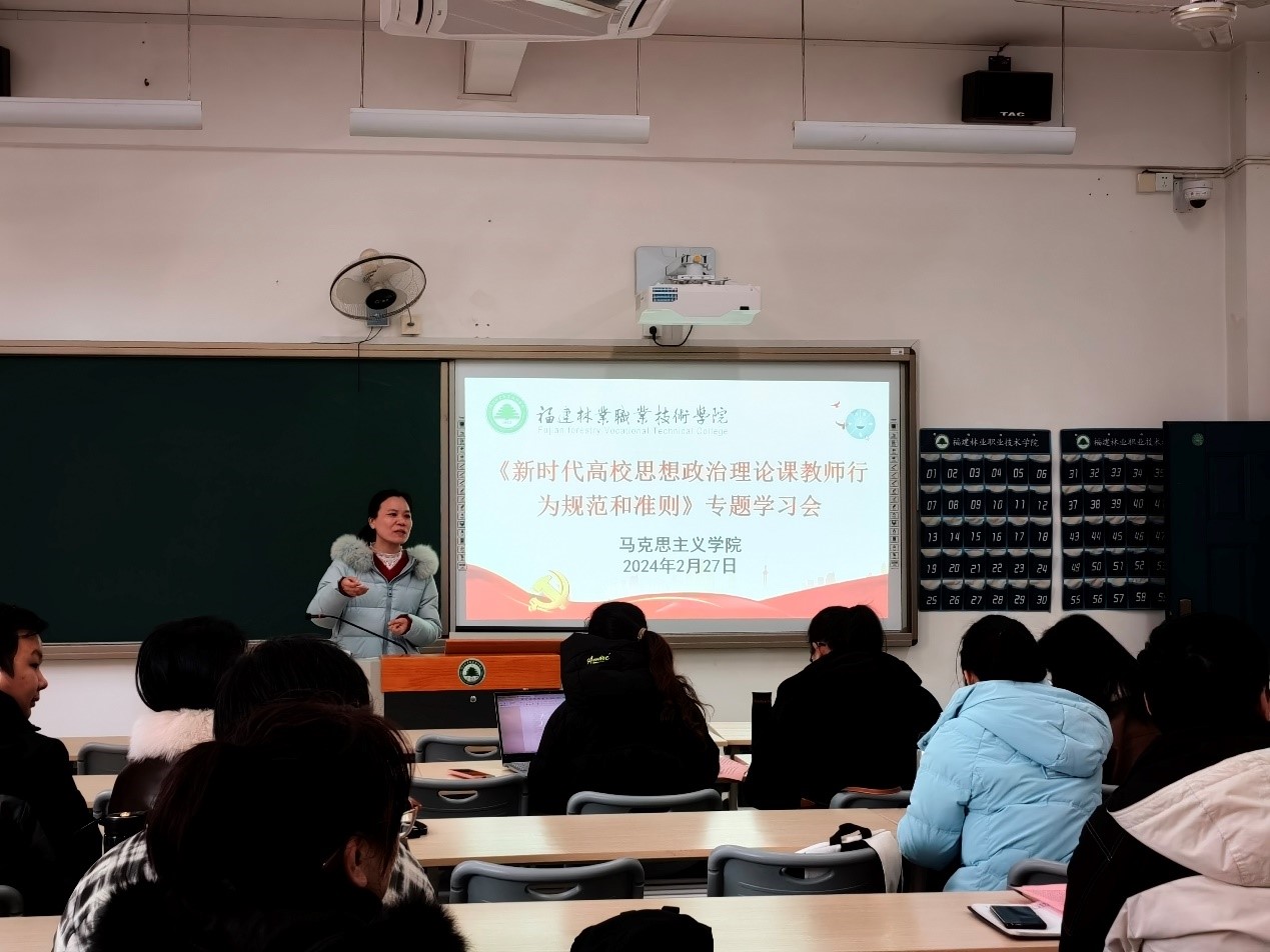 2024年2月27日,马克思主义学院组织学院全体思政课教师学习贯彻《新时代高校思想政治理论课教师行为规范和准则》,会议由马院院长邹小燕主持,马克思主义学院全体思政课教师参与了集中学习。