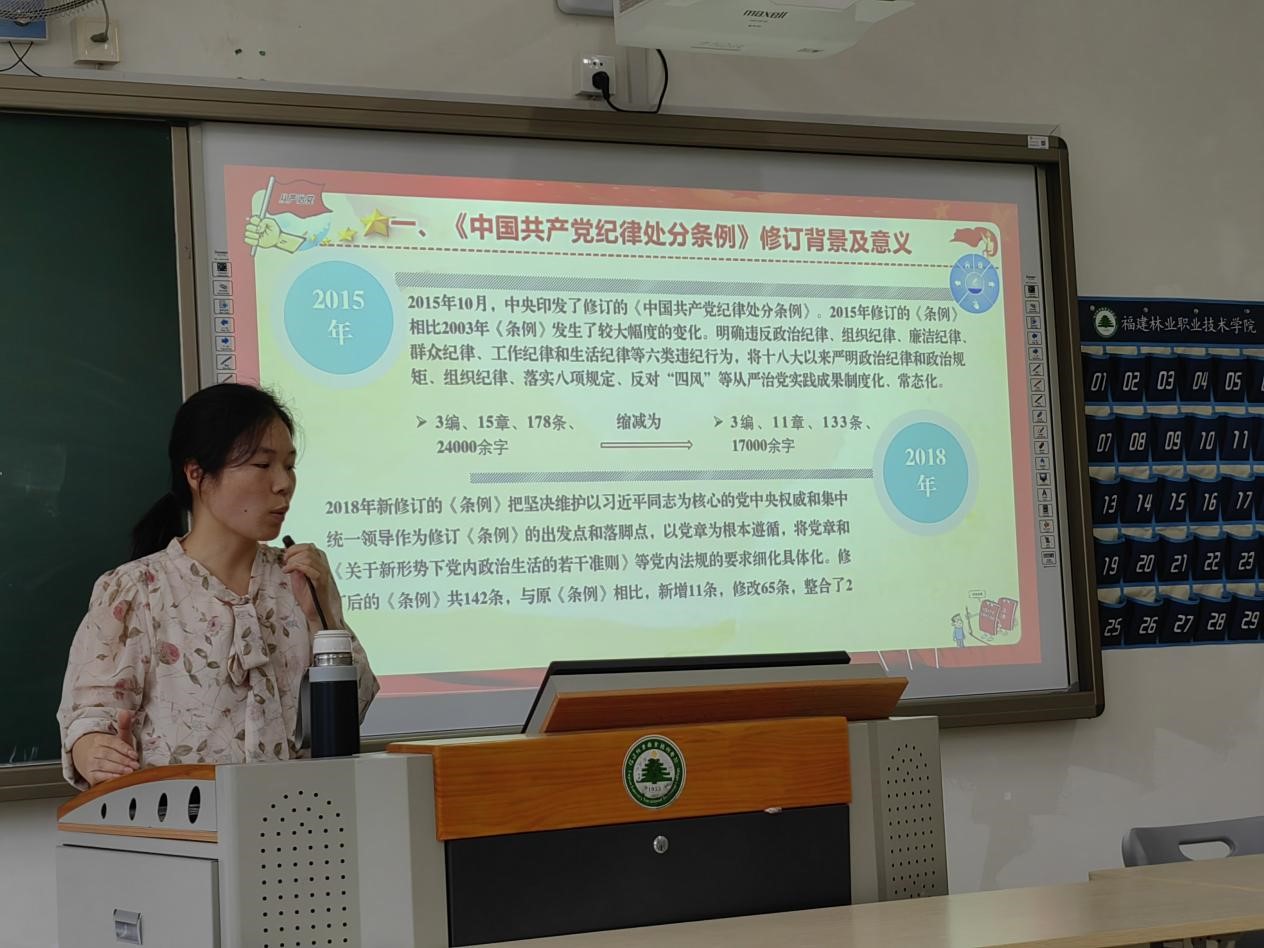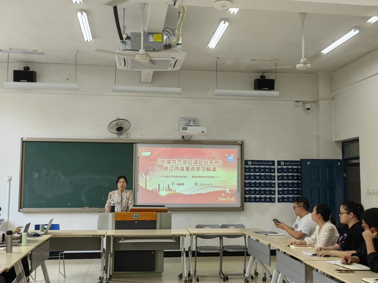 为扎实开展党纪学习教育,增强党员干部纪律意识,引导党员教师学纪、知纪、明纪、守纪。4月23日,马克思主义学院党支部召开学习《中国共产党纪律处分条例》专题党课,传达学习党中央新修订的《中国共产党纪律处分条例》(以下简称《条例》),本次党课由马克思主义学院党支部副书记陆晓莉同志主讲。