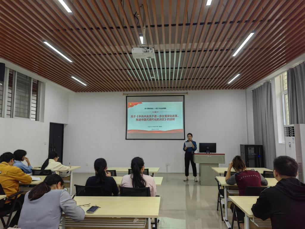 为深入学习贯彻党的二十届三中全会精神,全力推动党的二十届三中全会精神入脑入心入行,2024年10月29日,马克思主义学院党支部在行政楼马克思主义学院教学研讨室开展学习贯彻党的二十届三中全会精神专题党课活动,党支部副书记陆晓莉同志作《关于<中共中央关于进一步全面深化改革、推进中国式现代化的决定>的说明》的专题党课,马克思主义学院党支部全体党员教师参加学习。