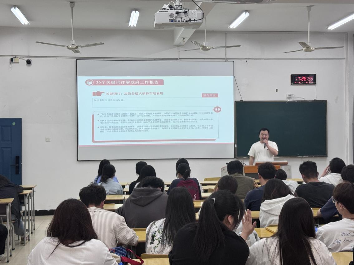 活动伊始,周偎老师向同学们介绍了本次政府工作报告的重要意义,报告总结成绩客观实在,分析形势精准深刻,制定目标科学合理,部署任务重点突出,是一个高举旗帜、务实创新、凝聚力量、催人奋进的好报告。政府工作报告不仅为国家发展指明了方向,也为青年学生提供了了解国家政策、把握时代脉搏的窗口。随后,老师以报告中提炼出36个关键词为线索展开深入探讨。“国内生产总值增长 5% 左右”“居民消费价格涨幅 2% 左右”“全方位扩大国内需求”“强化宏观政策民生导向”等,这些关键词涵盖了经济、科技、民生等多个领域,反映了国家在新一年的发展重点和目标。