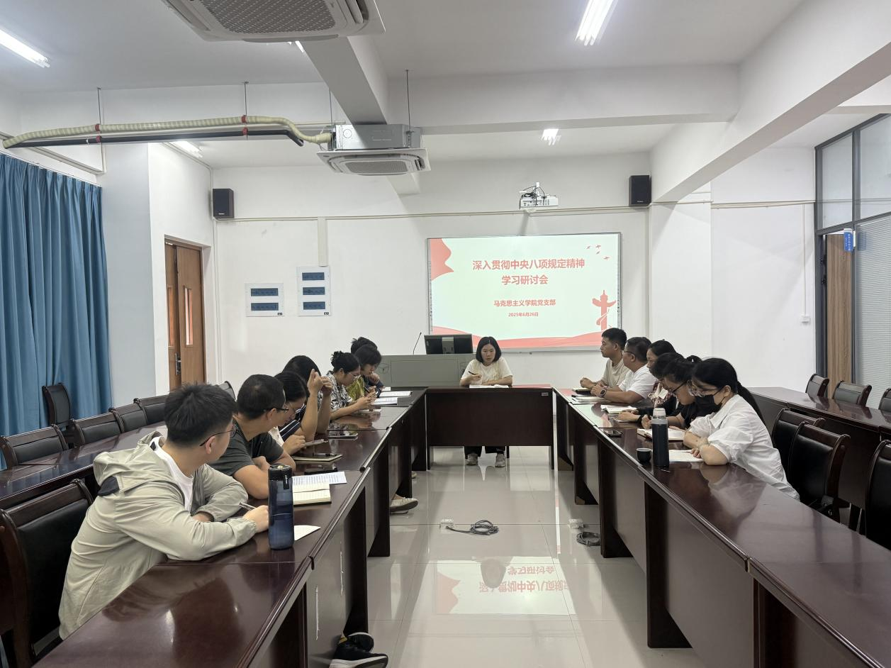 为推动深入贯彻中央八项规定精神学习教育走深走实,确保学习教育取得实效。6月26日下午,马克思主义学院党支部开展深入贯彻中央八项规定精神学习教育专题研讨会,马克思主义学院全体教师党员参会,会议由党支部书记陆晓莉主持。