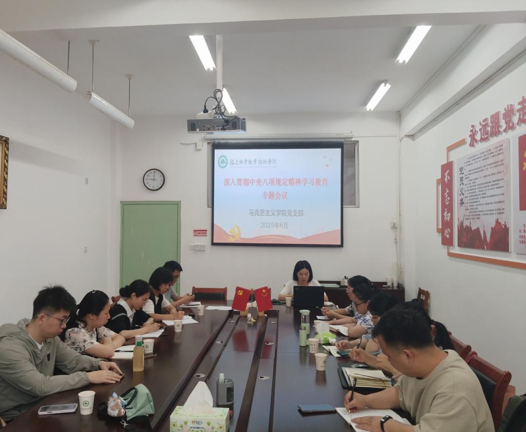 为深入贯彻中央八项规定精神学习教育,进一步推进全面从严治党,加强纪律作风建设和反腐败工作。6月24日,马克思主义学院党支部在行政楼四楼第二会议室开展深入贯彻中央八项规定精神学习教育专题会议,马院全体党员参加会议,会议由党支部书记陆晓莉主持。
