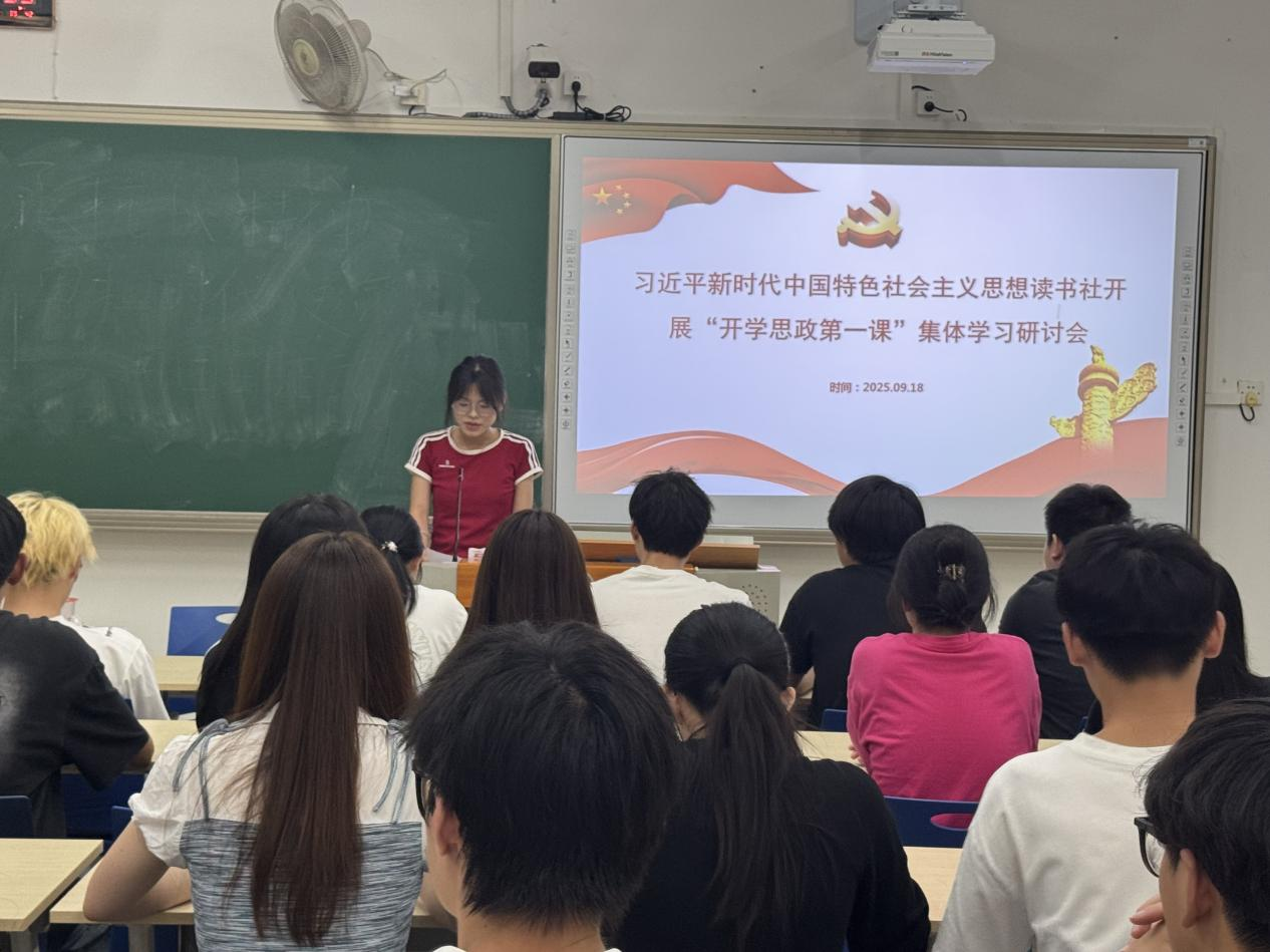 为贯彻落实《关于开展全国大中小学生同上一堂“弘扬伟大抗战精神做光荣自豪中国人——纪念中国人民抗日战争暨世界反法西斯战争胜利80周年”思政大课的通知》精神,习近平新时代中国特色社会主义思想读书社于9月18日在教学楼209举行“开学思政第一课”专题集体学习研讨活动,以思想激荡开启新学期奋进序章。