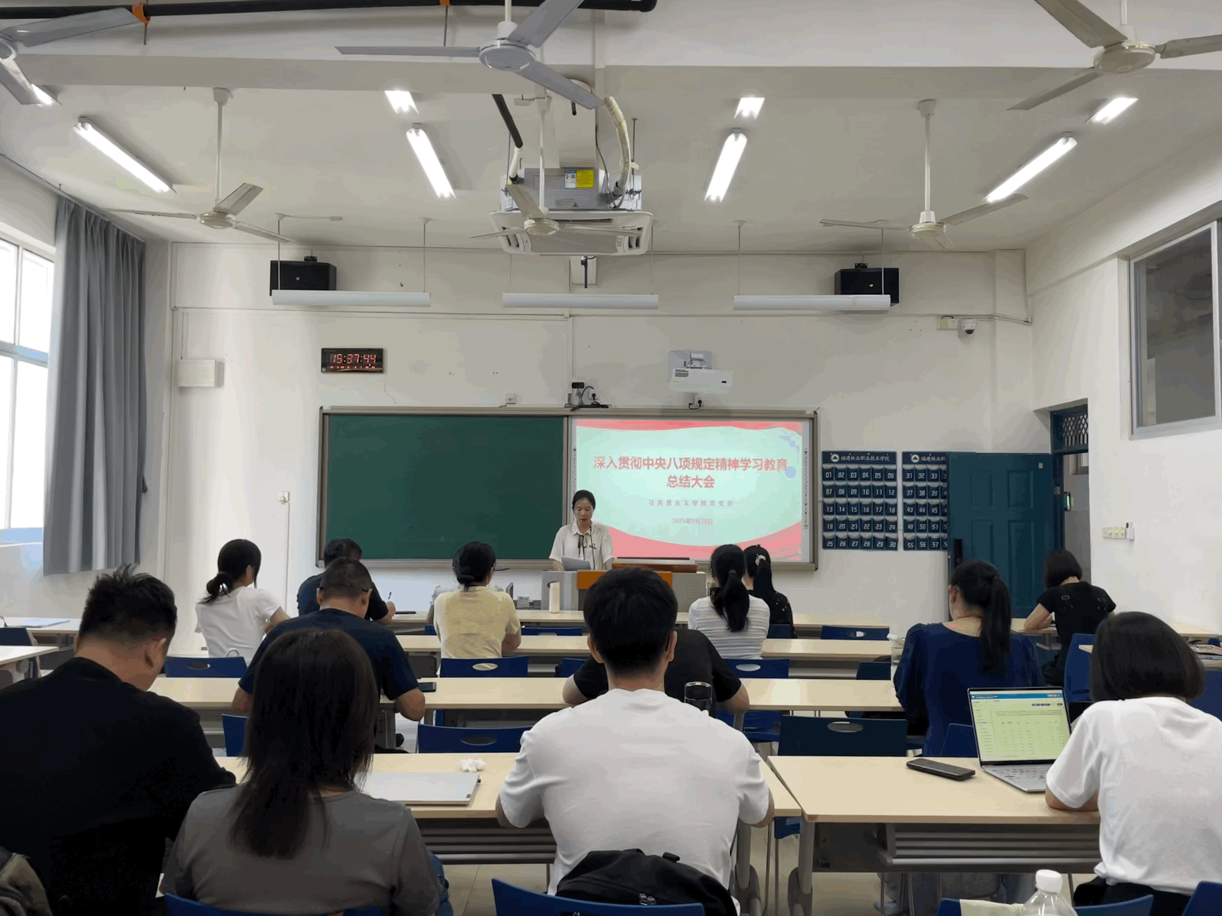为巩固拓展学习贯彻习近平新时代中国特色社会主义思想主题教育成果,巩固深化党纪学习教育成果,锲而不舍落实中央八项规定精神,推进作风建设常态化长效化,马克思主义学院于2025年9月28日召开深入贯彻中央八项规定精神学习教育总结大会。学院全体教师党员参会,会议由支部书记陆晓莉主持。