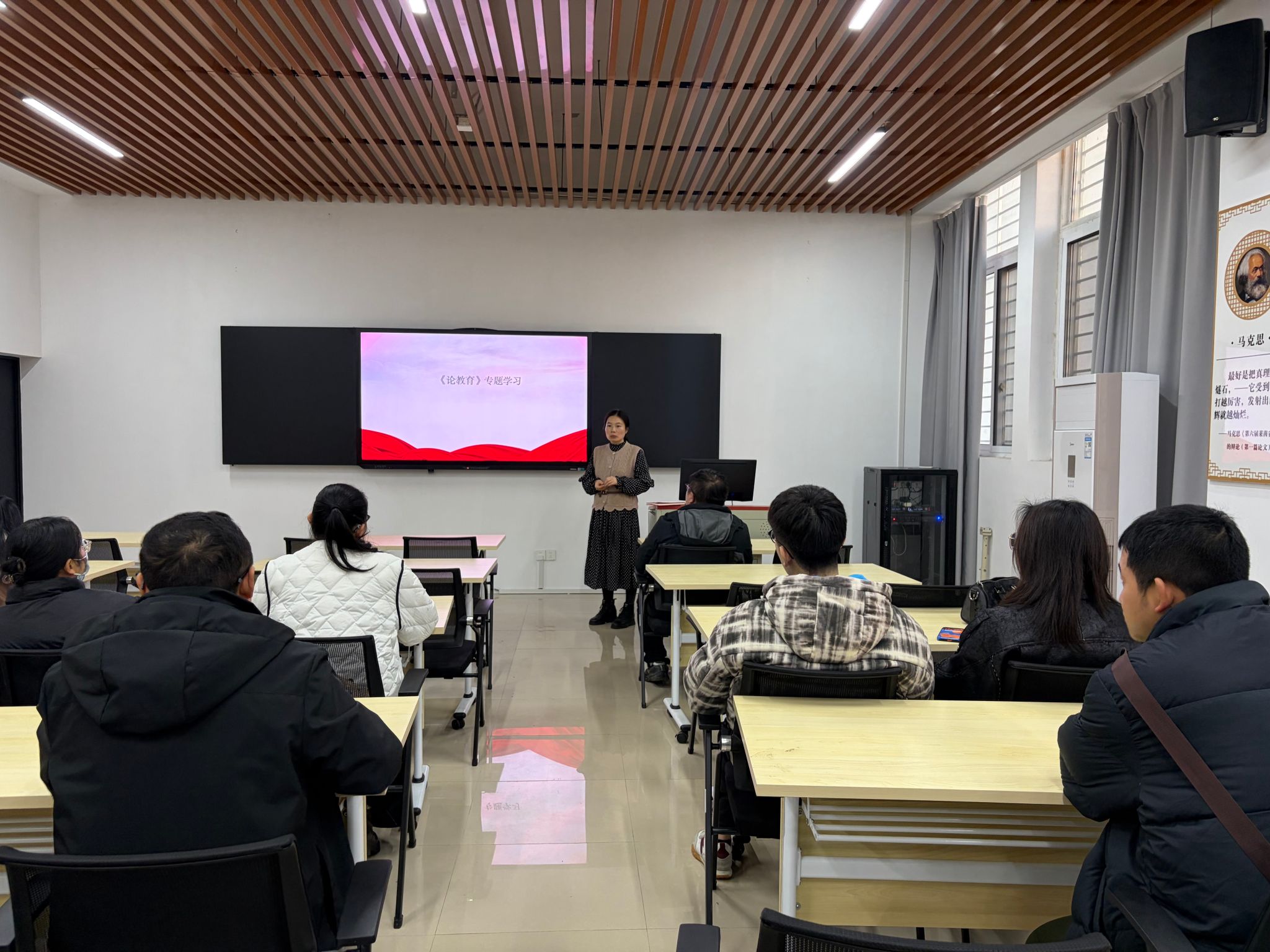 在《论教育》专题学习中,教师们深入学习文献中关于科教兴国战略、教育体制机制改革等重要论述,领会我国建成世界最大规模教育体系的重大成就与教育公平理念,深刻把握教师“大先生”角色定位与教育家精神内涵。大家表示,会把理论学习成果转化为思政课教学实效,坚守为党育人、为国育才的初心使命。