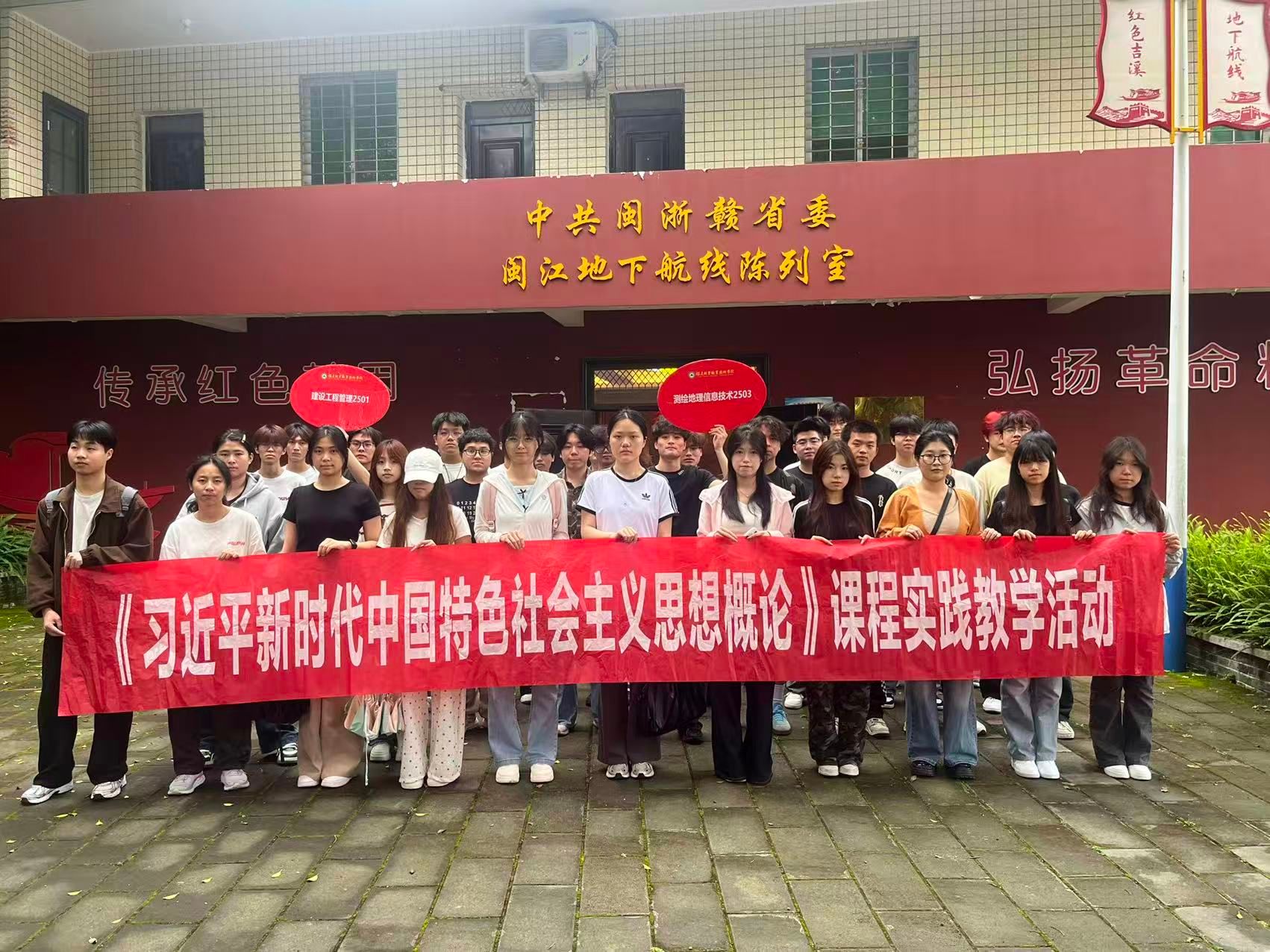 为深化对习近平新时代中国特色社会主义思想的理解,创新思政课教学形式,厚植青年学生爱党爱国情怀,4月21日,马克思主义学院组织测绘地理信息技术2503班、建设工程管理2501班师生,赴闽浙赣省委闽江地下航线纪念馆开展《习近平新时代中国特色社会主义思想概论》实践教学活动。