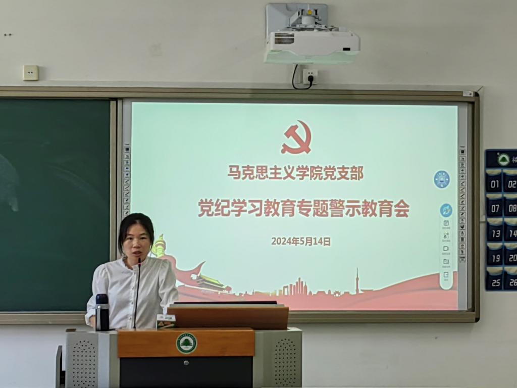 为全面落实党中央从严治党要求,提高监督执纪能力,增强党员法纪观念,根据学校党委学习工作部署,马克思主义学院党支部于5月14日组织马院全体党员开展了党纪专题学习教育警示会。会议由马克思主义学院党支部副书记陆晓莉主持。