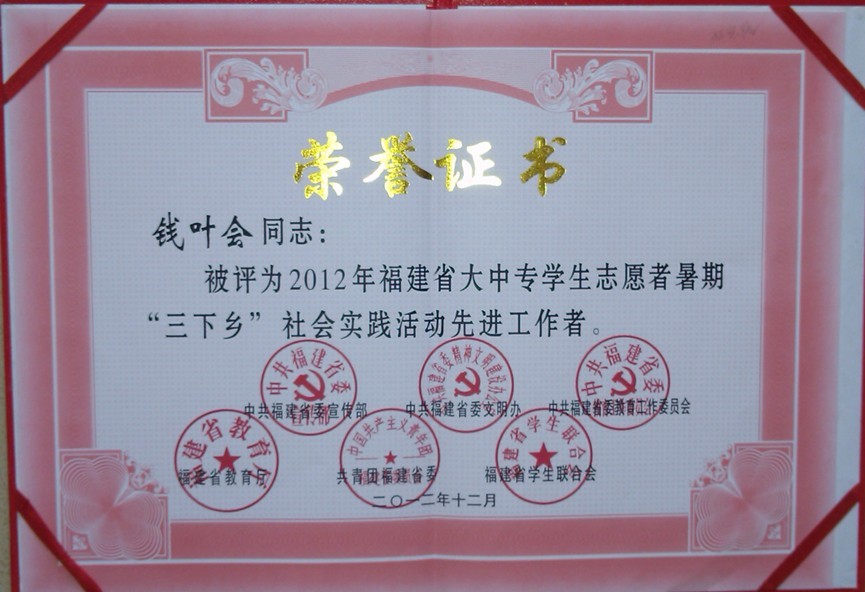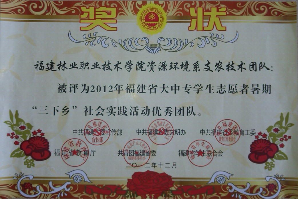 日前,省委宣传部、省委文明办、省委教育工委、省教育厅、团省委、省学联决定表彰一批在2012年福建省大中专学生志愿者暑期“三下乡”社会实践活动中涌现出来的先进集体和个人。我院“三下乡”实践队资源环境系支农技术团队、土木工程系就业创业服务实践团被评为省级优秀团队,我院钱叶会老师被评为社会实践活动先进工作者,资源环境系黄志宁同学被评为社会实践活动先进个人。