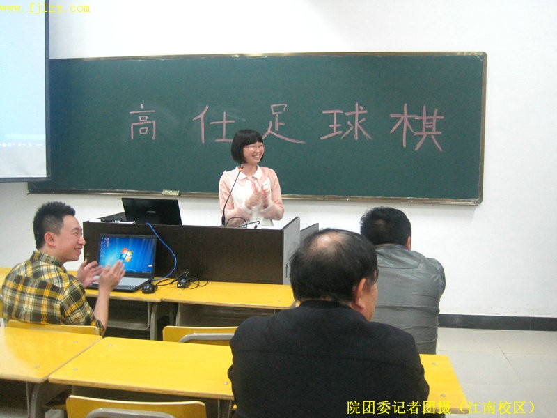 由共青团福建林业职业技术学院委员会主办的,院学生会社团部棋艺协会承办,福建省高仕足球棋协会协办的“高仕足球棋讲座”,于4月25日晚7点30分在我院江南校区实训四号楼505室拉开序幕。此次活动邀请到“高仕足球棋”的发明人高永平和周碧丹两位嘉宾为同学们现场讲解。此外,福建高仕足球俱乐部代表鞠连健和南平高仕足球棋代表黄永武等也出席了此次活动。
