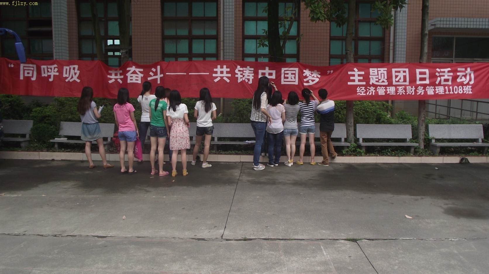为积极响应学院团委及经济管理系团总支的号召,2013年6月5日,经济管理系财务管理1108班团支部在天麟校区学院礼堂门口及延平区文化广场举办了“同呼吸·共奋斗——共筑中国梦”主题团日活动,全班33位团员和有关指导老师参加了活动。此项活动是我院“汇聚青春正能量 共铸我的中国梦”主题团日立项活动重点项目。