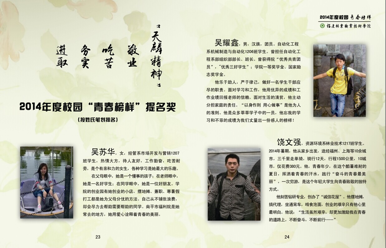 为大力推进我院学生思想教育工作,以身边榜样引领学生成长成才,展现我院学生自强不息、奋发向上的精神风貌,发挥榜样示范作用。2014年3月,院团委启动“青春榜样”人物评选活动,在全院范围内掀起了一股发现校园里的美——寻找校园“青春榜样”热潮。通过校园“青春榜样”评选,在广大学生中充分发掘奋发进取、无私奉献的典型人物,发现校园里的美,以先进的事迹感染人、以进取的精神激励人、以身边的榜样引导人,充分展示我院学生风采,为实现学校持续、健康、有序、高效发展提供强大的精神动力。