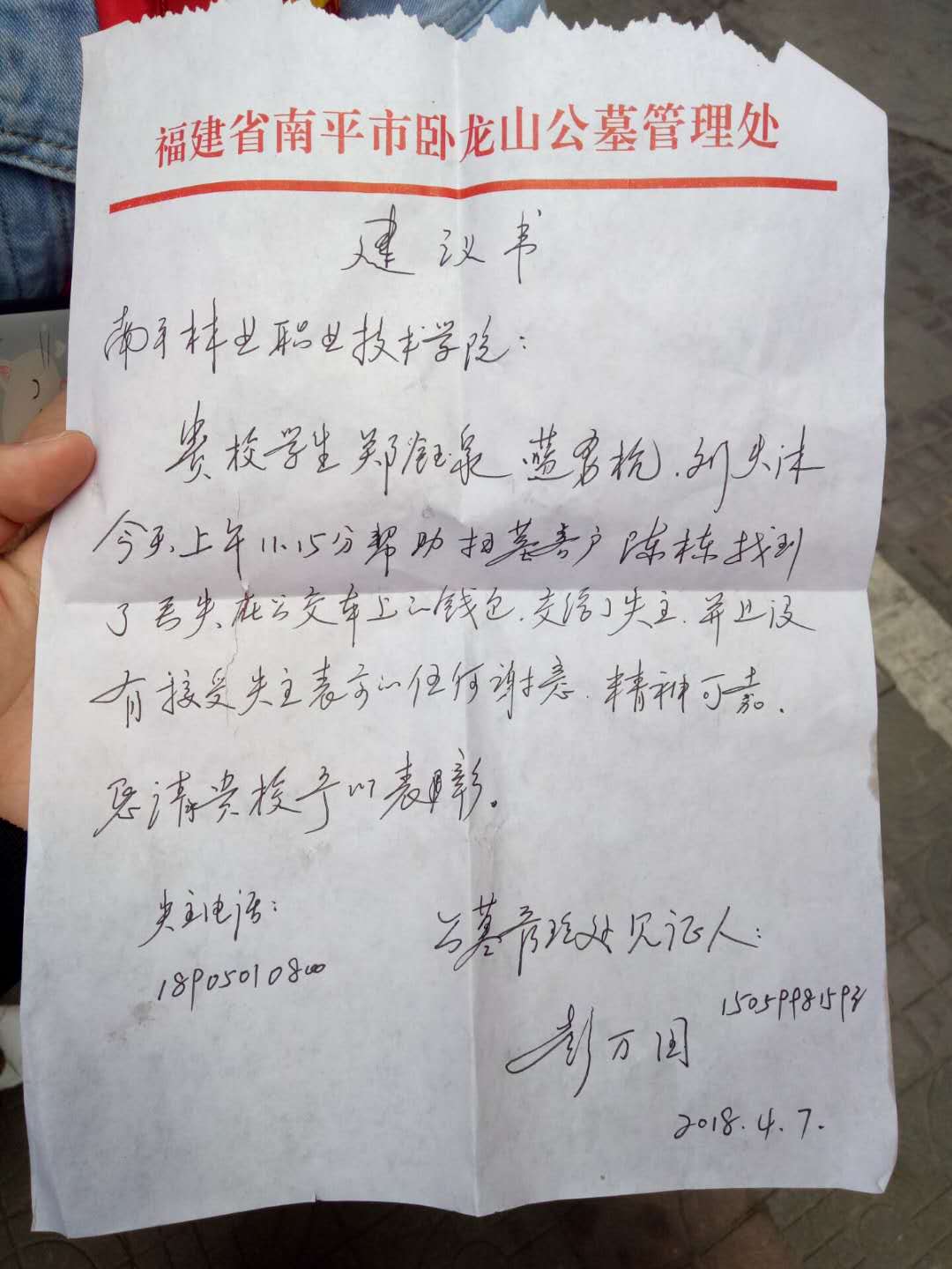 4月7日上午,市民陈先生到卧龙山公墓祭扫时,不慎将随身钱包遗落在搭乘的公交车上,钱包内有银行卡、身份证、医保卡、现金等物品。我院三名学生志愿者得知后,热心帮其找回。