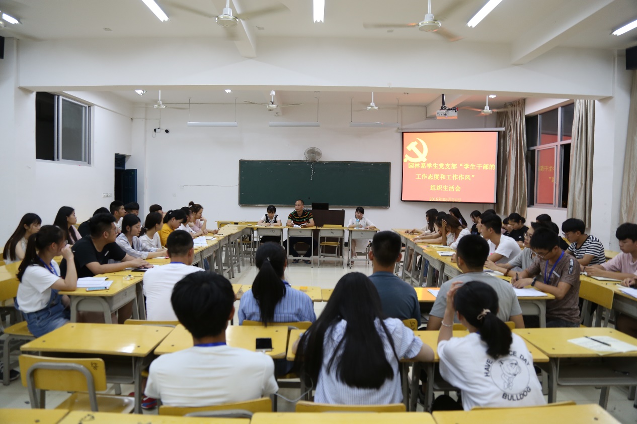 园林系学生党支部于2018年5月24日晚上在实训四510教室召开“学生干部工作态度和工作作风”专题组织生活会。此次会议由党支部书记陈剑勇老师主持。陈书记首先从多个角度分析开好此次专题组织生活会的重要意义,就什么是学生干部,什么是学生干部应有的工作态度和工作作风问题进行了阐述。他强调,要应用好“批评与自我批评”这个党内政治生活的法宝,以严肃认真的态度开好组织生活会,确保广大党员、预备党员和入党积极分子经受一次严格的政治生活锻炼,共同营造一个风清气正的政治生态。他希望大家畅所欲言,共同为学院和系部干部的培养和成长出谋划策。