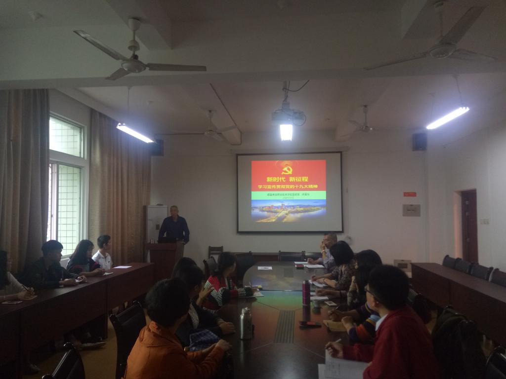 2018年10月16日下午,艺术设计系在系会议室开展了“新时代、新征程——党的十九大精神宣讲会”活动,活动由思政部主任洪福兴主讲。洪主任围绕“我国发展的历史方位”“新时代的历史和现实依据”“新时代的内涵”“新时代新征程”等4个方面的问题展开了讲座。洪主任的讲座既有对概念的准确把握,体现了研讨问题的科学性,又有严密的逻辑性和丰富的多样性结合,体现了历史唯物主义的立场和视角,博得了与会党员的阵阵掌声。