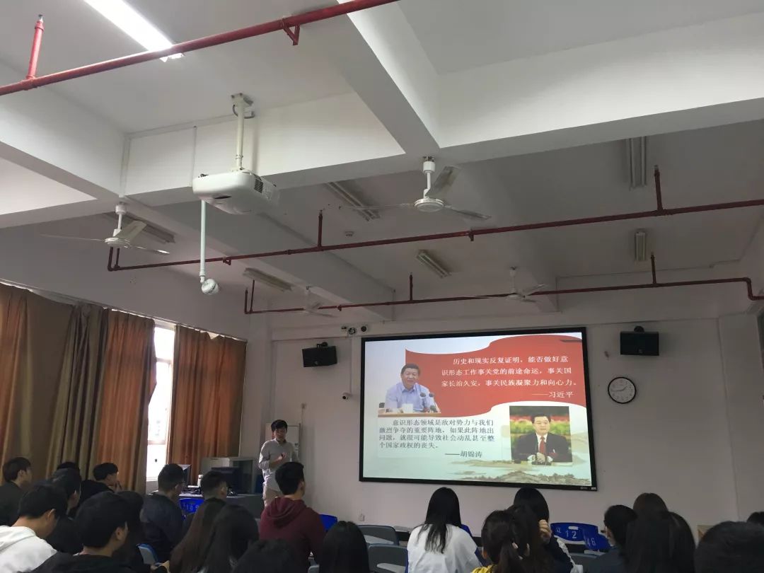 首先应老师为同学们解释“意识形态”的含义,接着从东西方意识形态斗争的由来及演变、我国当前面临的意识形态渗透挑战、提升大学生党员自身的意识形态能力等方面展开,通过同学们身边的生动案例、网络大v事件、历史溯源、流行电影等,为同学们深入浅出的讲述问题本质。
