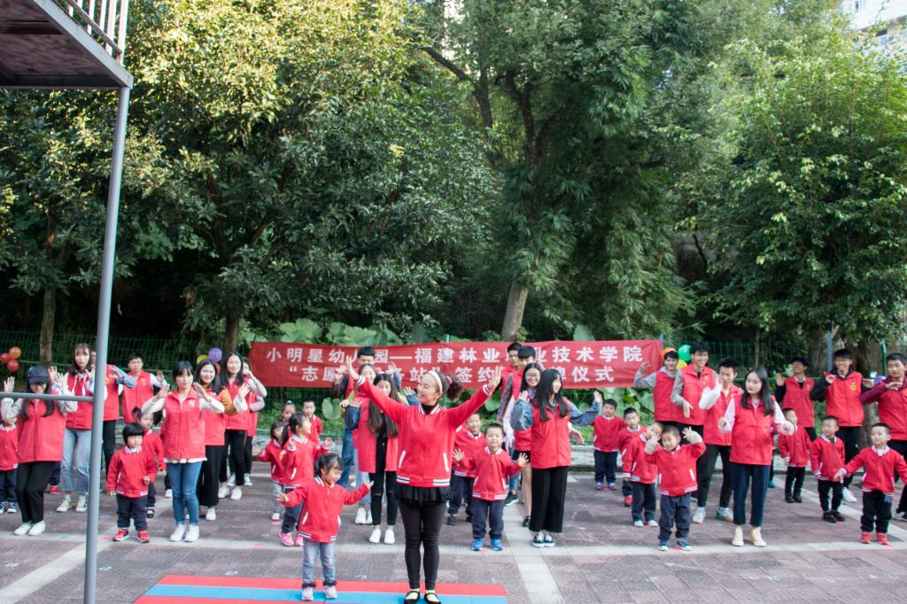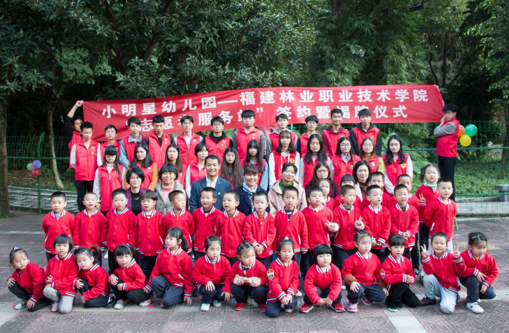 2018年11月29日下午,福建林业职业技术学院的师生一行30名党员来到紫云街道小明星幼儿园,为共建志愿者服务站开展签约授牌仪式。