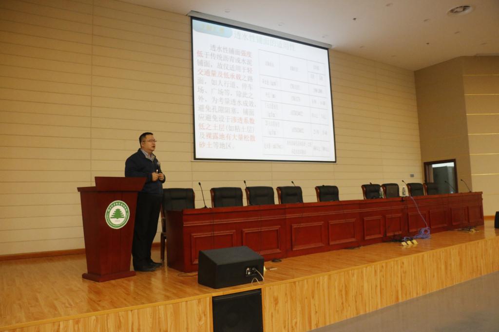 梁教授从绪论、研究架构,文献汇整,研究方法,研究结果以及结论与建议等方面进行论述,以中国台湾为例,进行热岛效应的分析和研究。首先介绍了研究的大概框架与思路,阐明使用透水性铺面的效益:改善地下土壤生态;增加地表雨水渗透;减少排水系统负担及排水设施;利用透水性吸收污染源及降低噪音;增加土壤涵养水分;降低热岛效应;提升路面抗滑性;减轻因日光反射而造成之目眩。梁教授还向我们展示他的研究成果:沥青混凝土相关物性实验,低密度透水底渣混凝土配比材料使用表。梁教授用严谨的实验及大量的数据分析,通过幽默风趣的语言及贴近生活的例子,赢得在场学生的共鸣和阵阵掌声。