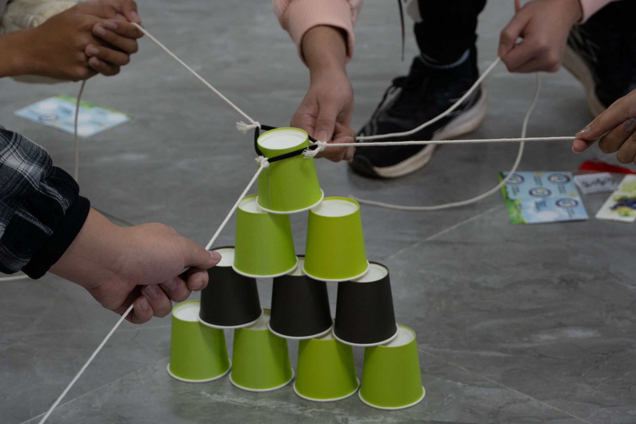 美育显于团队的共创里,多人一组用绳圈叠纸杯“金字塔”,是对“协作美学”的生动实践:有人指挥定策略,是“统筹之美”;有人精准控力度,是“执行之美”;有人紧盯全局稳节奏,是“配合之美”。没有手的直接触碰,反而让同学们更注重“集体创作的和谐感”——每一个纸杯的堆叠,都需兼顾平衡与效率,每一次调整都需团队审美共识的统一。当“金字塔”稳稳矗立,欢呼声不仅是对成功的庆贺,更是对“团队共创之美”的认可,让美育在协作中落地,证明“美不仅是个人创作,更是集体智慧的结晶”。